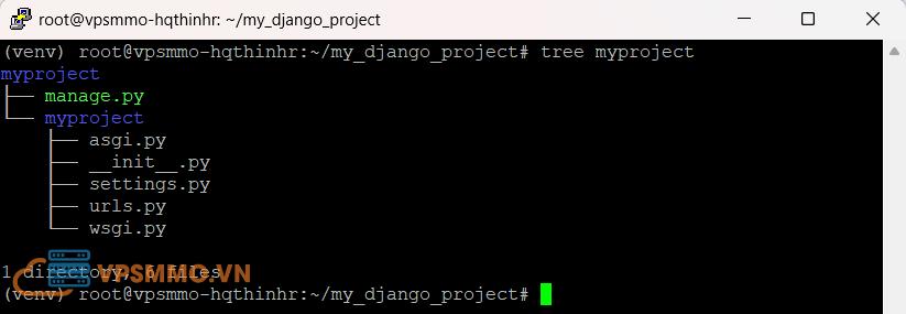 Lệnh này sẽ tạo một thư mục myproject myproject với cấu trúc tệp cơ bản của Django, bạn có thể kiểm tra lại cấu trúc thư mục với lệnh tree: