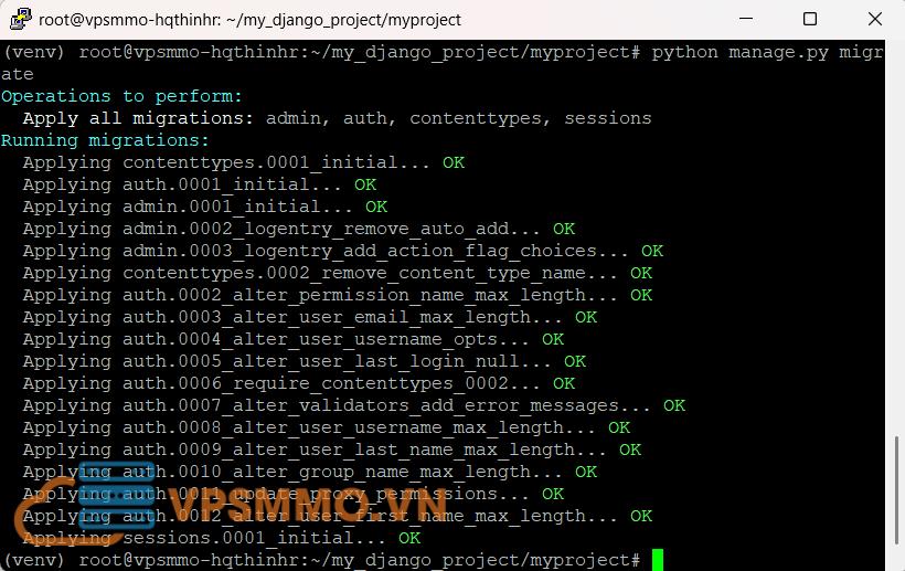 Chạy lệnh python python manage.py migrate để áp dụng các migrations, tạo hoặc cập nhật các bảng trong cơ sở dữ liệu dựa trên mô hình của ứng dụng Django. Sau khi hoàn tất, cơ sở dữ liệu sẽ sẵn sàng cho các tính năng như quản trị viên hoặc xác thực người dùng.