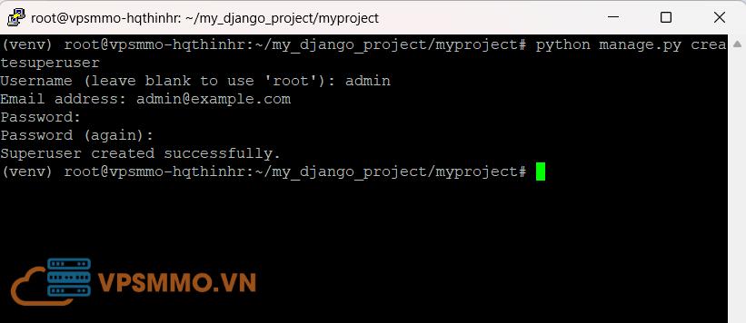 python manage.py createsuperuserLàm theo hướng dẫn để nhập thông tin: