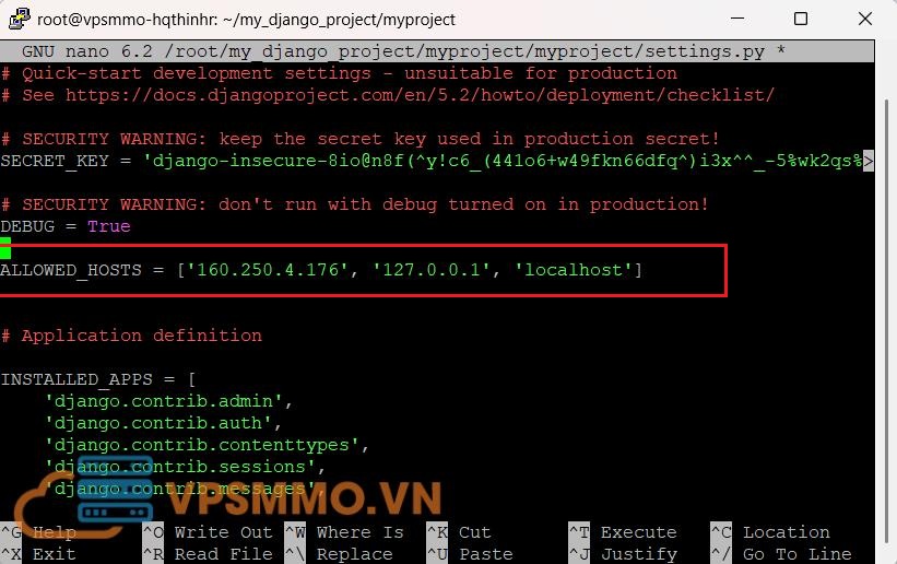 nano /root/my_django_project/myproject/myproject/settings.pyTìm dòng ALLOWED_HOSTS và sửa đổi để thêm địa chỉ IP của VPS (ví dụ: 160.250.4.176):