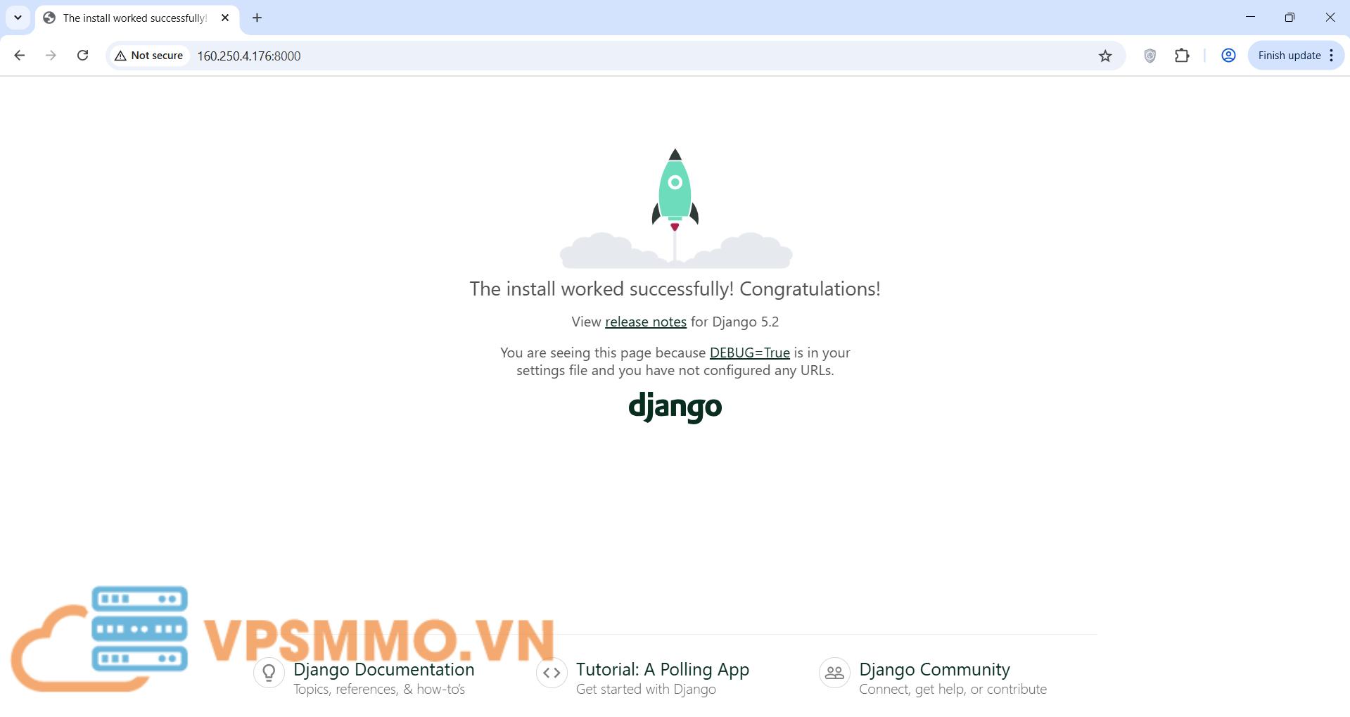 python manage.py runserver your-ip-vps:8000Thay your-ip-vps bằng IP máy chủ của bạn. Truy cập lại http://160.250.4.176:8000 trong trình duyệt. Bạn sẽ thấy trang chào mừng của Django nếu cấu hình đúng.