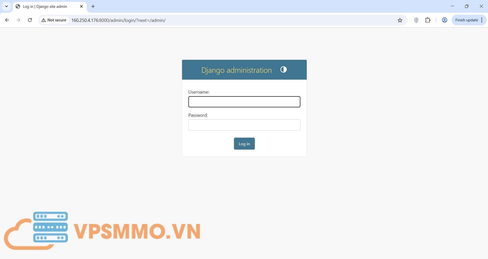 Để truy cập bằng cho máy chủ từ xa, bạn cần cấu hình ALLOWED_HOSTS trong tệp settings để cho phép VPS IP hoặc tên miền của bạn.