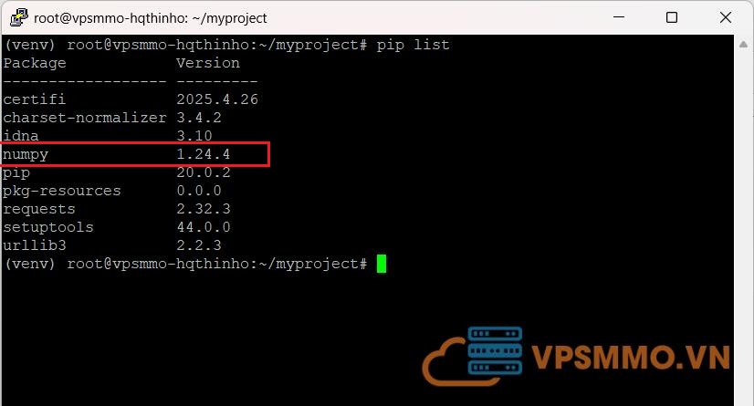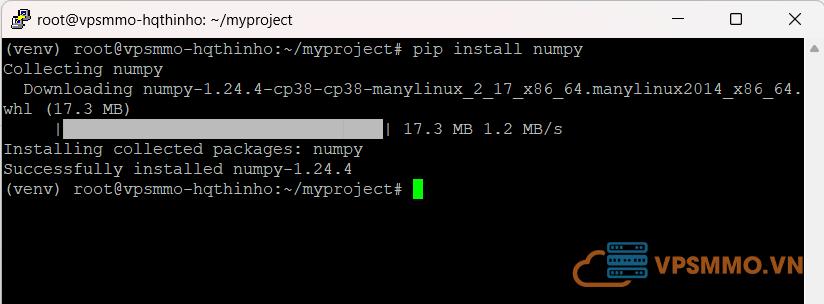 Trong môi trường ảo, bạn có thể cài đặt các thư viện bằng pip mà không ảnh hưởng đến hệ thống toàn cục. Ví dụ, cài đặt thư viện numpy: