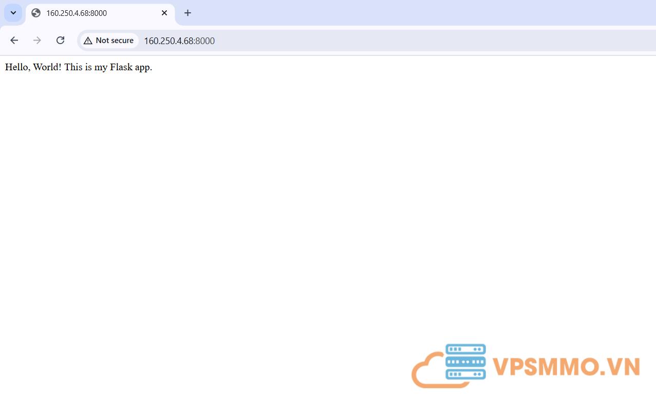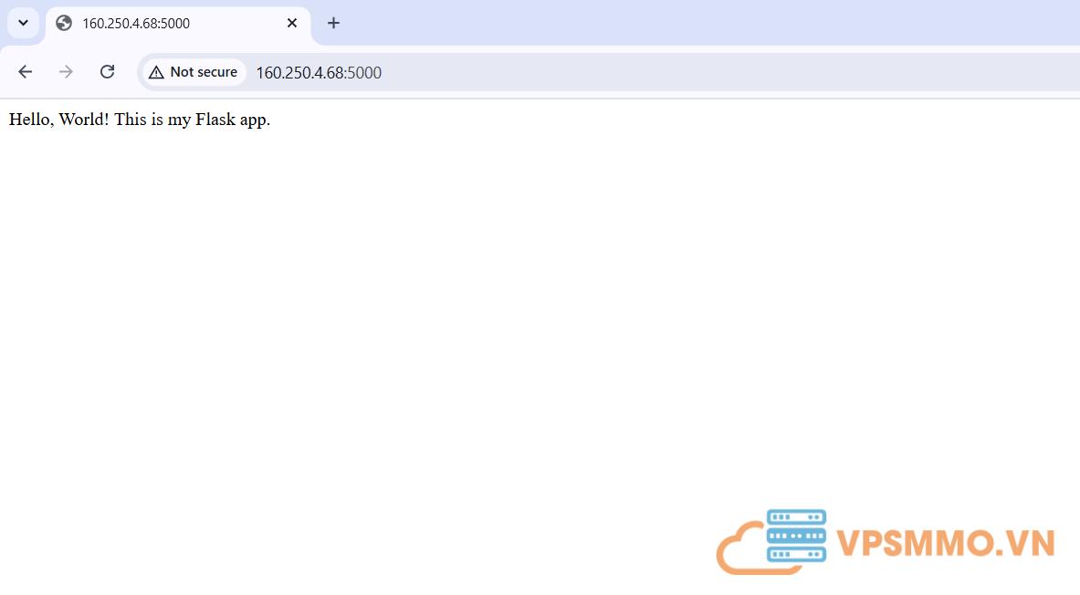 Truy cập http://your_vps_ip trên trình duyệt. Nếu thấy thông báo “Hello, World! This is my Flask app.”, ứng dụng đã được triển khai thành công.