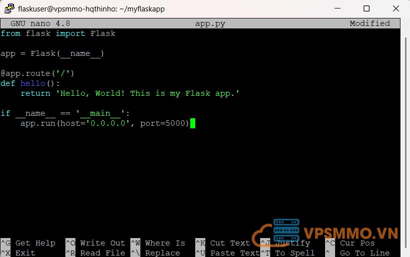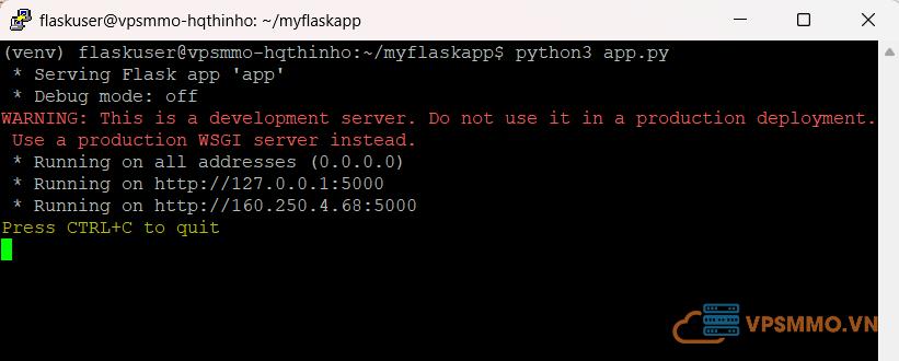 Truy cập http://your_vps_ip:5000 trên trình duyệt để kiểm tra. Nếu thấy thông báo “Hello, World! This is my Flask app.”, ứng dụng hoạt động bình thường. Nhấn Ctrl+C để dừng.